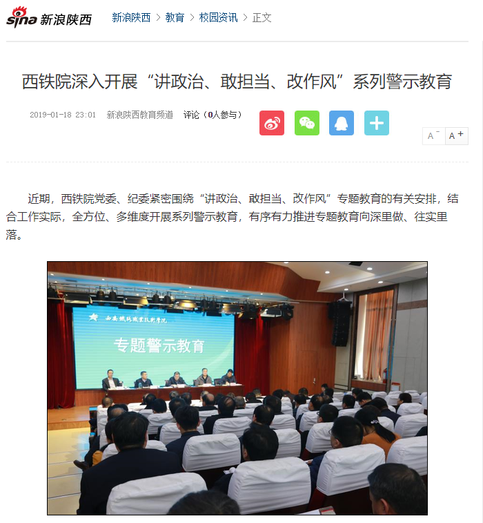 新浪陕西:西铁院深入开展“讲政治、敢担当、改作风”系列警示教育