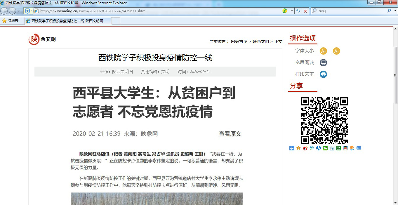陕西文明网:西铁院学子积极投身疫情防控一线