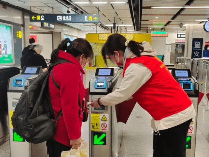 志愿者们以小组为单位,身穿红马甲,向地铁工作人员请教学习,为乘客提供引路服务,帮助乘客使用自动售票机买票,在列车旁维护上下车的秩序等服务。