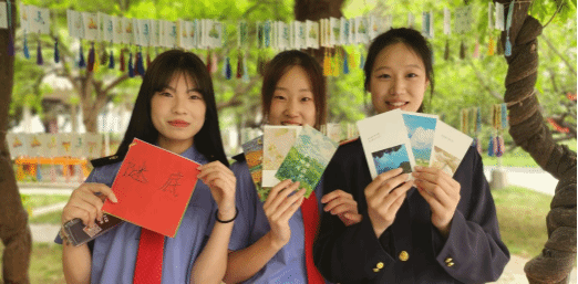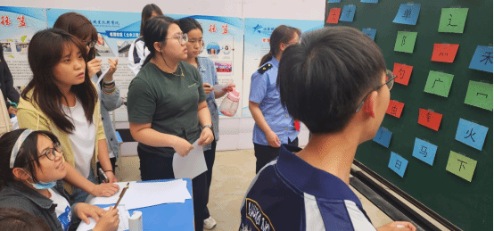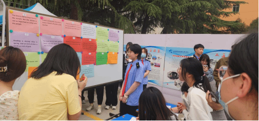 活动现场,师生们参与热情高涨,人头攒动,大家在各个活动区域前流连忘返。参加活动的同学纷纷化身为“翻译官”“组字高手”“手绘达人”“包书巧手”。“闻书香·忆书名 浩瀚书海猜猜猜”活动的打鼓声响起,将整个活动推向高潮。同学们击鼓传花,并根据工作人员的描述来猜书名。活动现场激烈与紧张并存,笑声不断。漂流笔记、猜字谜现场布置氛围感十足,同学们争相拍照打卡。
