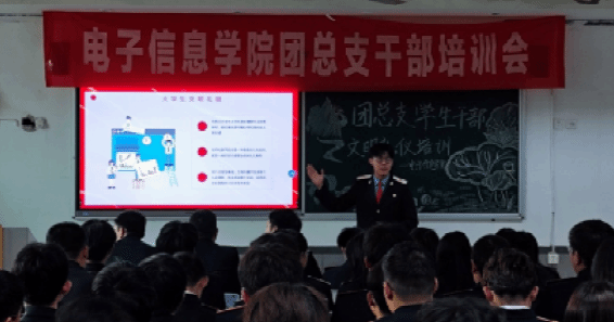 12月19日,电子信息学院团总支在教学楼307教室开展了以“讲文明、树新风、懂礼貌”为主题的学生干部文明礼仪培训活动。本次活动旨在进一步强化学院学生干部综合素质建设和提高工作实践能力。