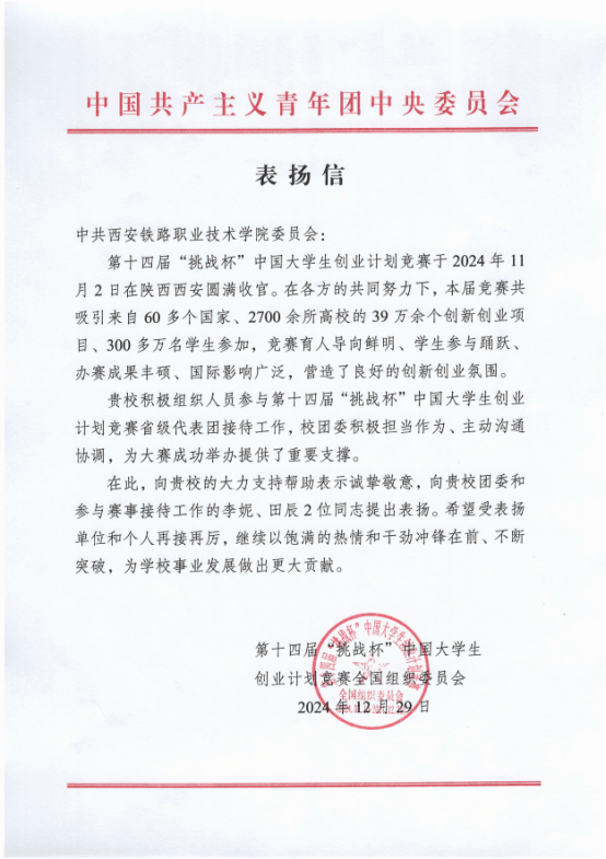 第十四届“挑战杯”中国大学生创业计划竞赛于2024年11月在陕西西安成功举办。本届竞赛共吸引来自60多个国家、2700余所高校的39万余个创新创业项目、300多万名学生参加,竞赛育人导向鲜明、学生参与踊跃、办赛成果丰硕、国际影响广泛,营造了良好的创新创业氛围。 赛事中,必赢官网除了组织参赛团队认真备赛,同时接到了接待省级代表团的工作任务,自接到赛事接待工作任务后学院高度重视并积极响应,主动作为,充分发挥了组织协调作用,为大赛的成功举办提供了坚实支撑。 下一步,必赢官网将以此次受共青团中央表扬为契机,持续加大创新创业支持力度,引导学生将所学知识应用于实际,提升解决复杂问题的能力,鼓励更多学子积极投身创新创业实践,培养造就更多具有创新精神和实践能力的高素质技术技能人才。