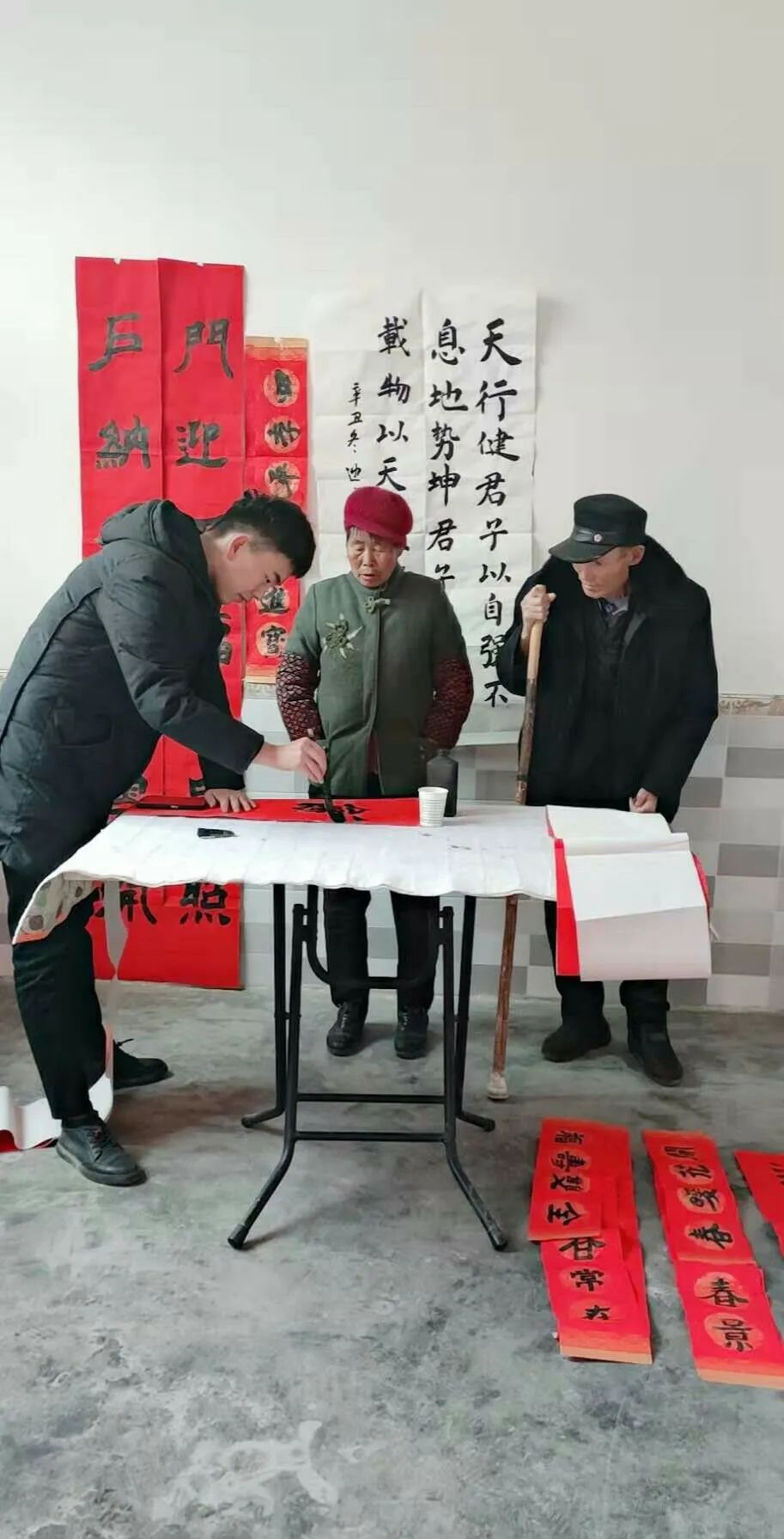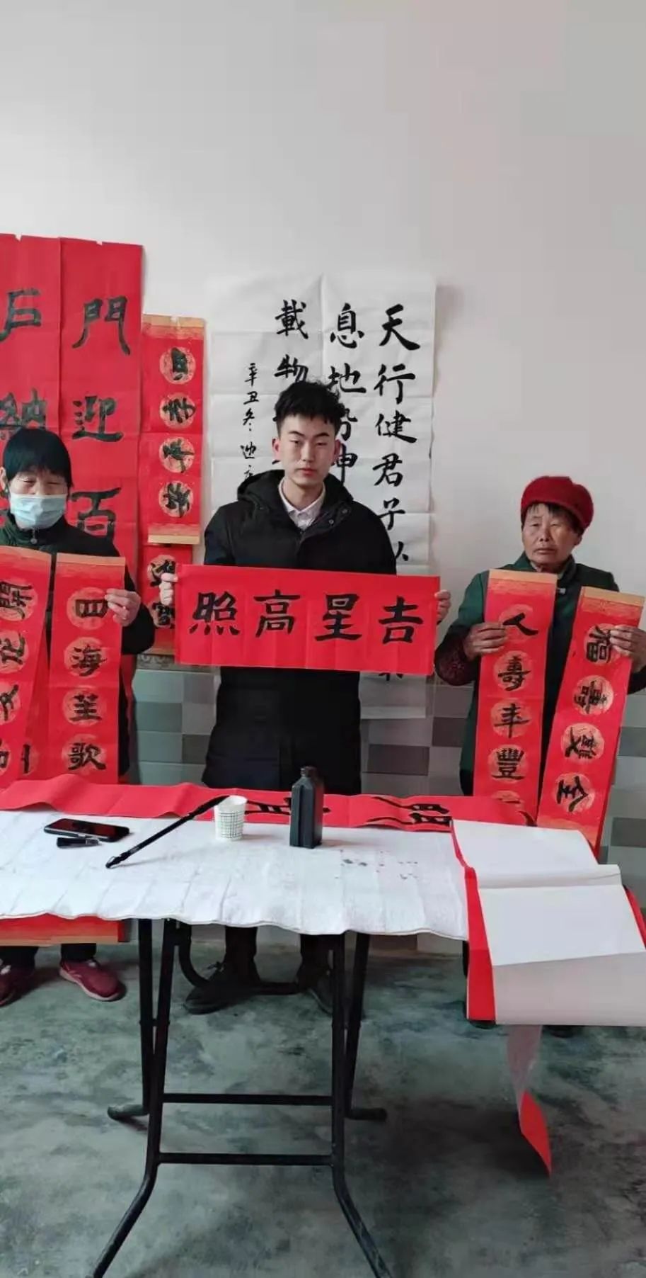 陕西省兴平市南位镇留位村:边康凯同学寒假期间在自己家乡开展了“迎新春、赠春联、送温暖”志愿服务活动,结合自己的书法特长,为村上的老人们书写春联,并免费为老人们赠送春联这有温度、有意义的“文化年货”。