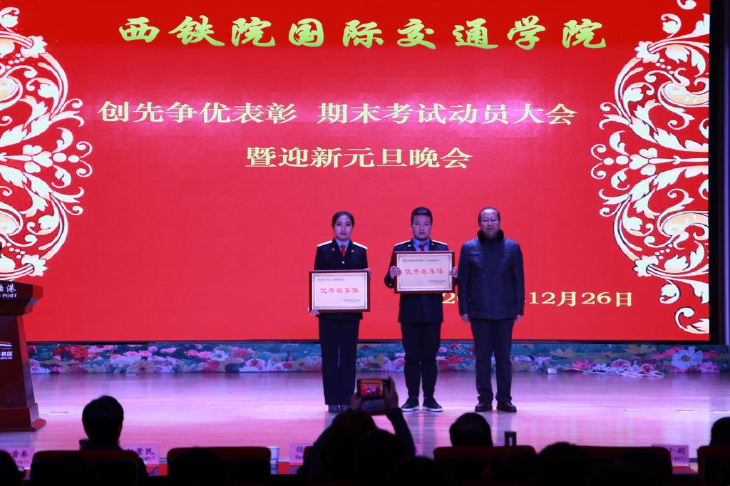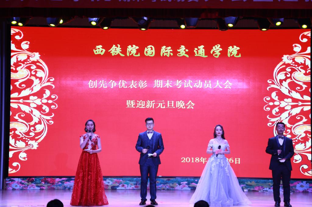 12月26日下午,由国际交通学院主办的“创先争优表彰 期末考试动员大会暨迎新元旦晚会”在西安国际港务区管理委员会2楼多功能厅举行。学院党委组织部部长任治军、宣传部部长张家琪、人事处处长赵西平、学生工作部部长郭小莉、副部长高阿联、院团委副书记张治平、国际交通学院院长赵景民、副院长韩发强及各二级学院党总支书记参加活动,国际交通学院全体师生共同到场观赏晚会,大会由韩发强主持。