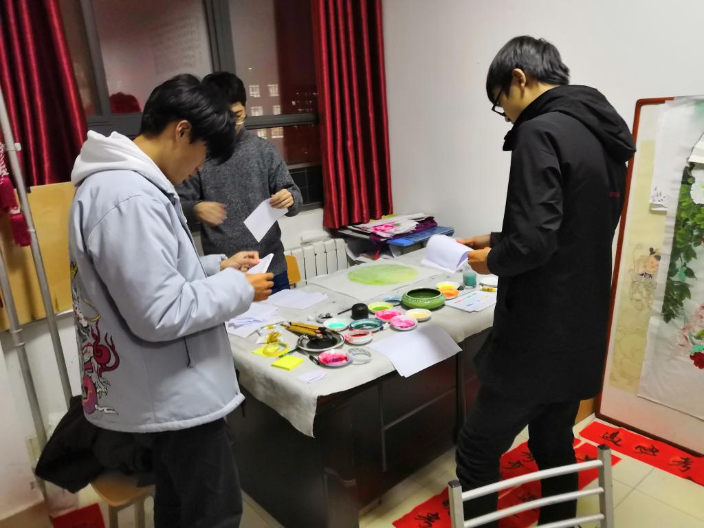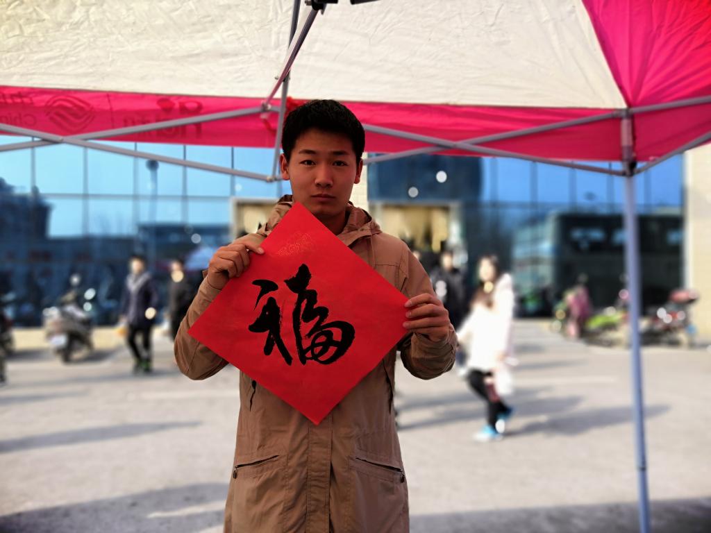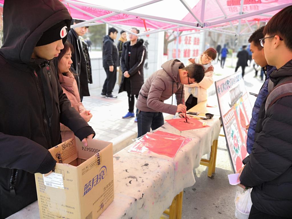 活动一开始,书画协会现场发放礼品,抽到对联和福字的同学送一副对联或福字,未抽到的师生赠送一件小礼物。所有的奖券抽完之后回收再利用,回归抽奖盒。书画协会的同学们现场书写“福”字,送祝福,在观众的掌声和赞叹声中活动被推向了高潮。