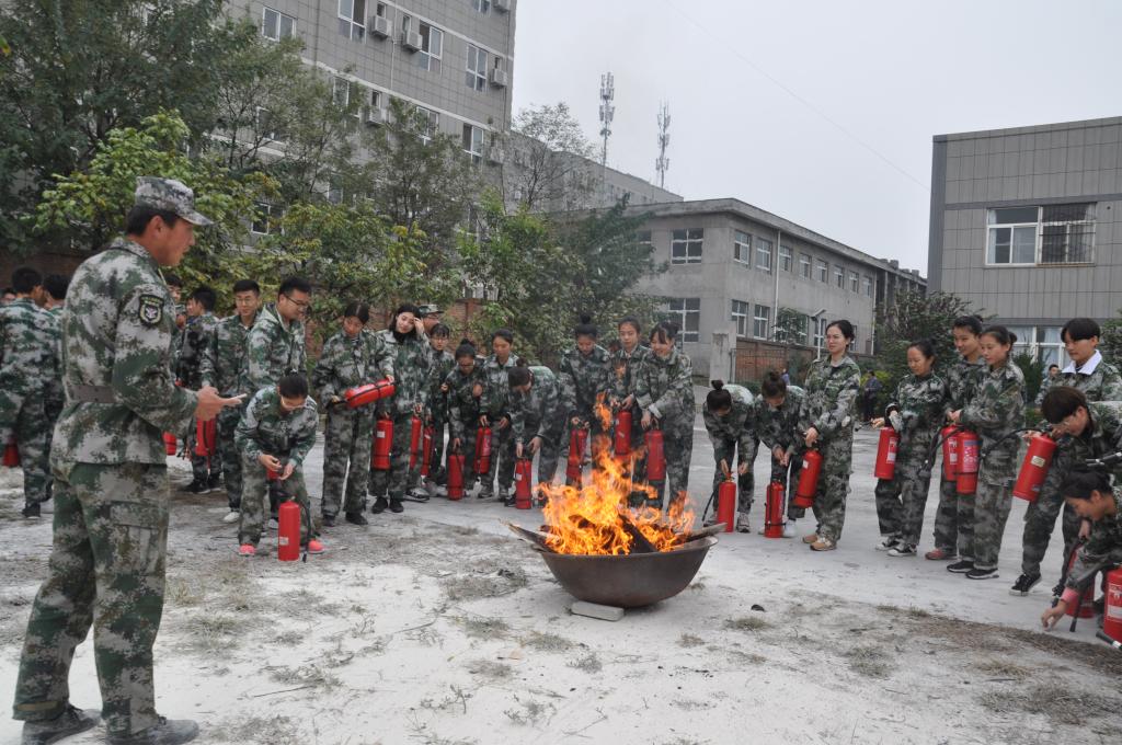 在灭火演练现场,军训教官为学生介绍了灭火器的正确使用方法,新生按照操作步骤分批次使用灭火器进行灭火演练,保卫干部在此过程中指导学生正确使用灭火器。