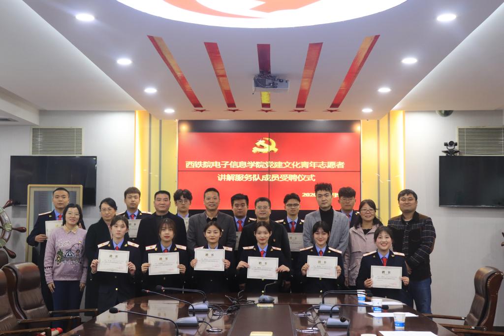 受聘仪式上,组织员李璇宣读了西铁院电子信息学院党建文化青年志愿者成员名单。电子信息学院党总支书记张伟敏、院长董奇以及副院长冯国良为这十二名志愿者服务队成员聘书。