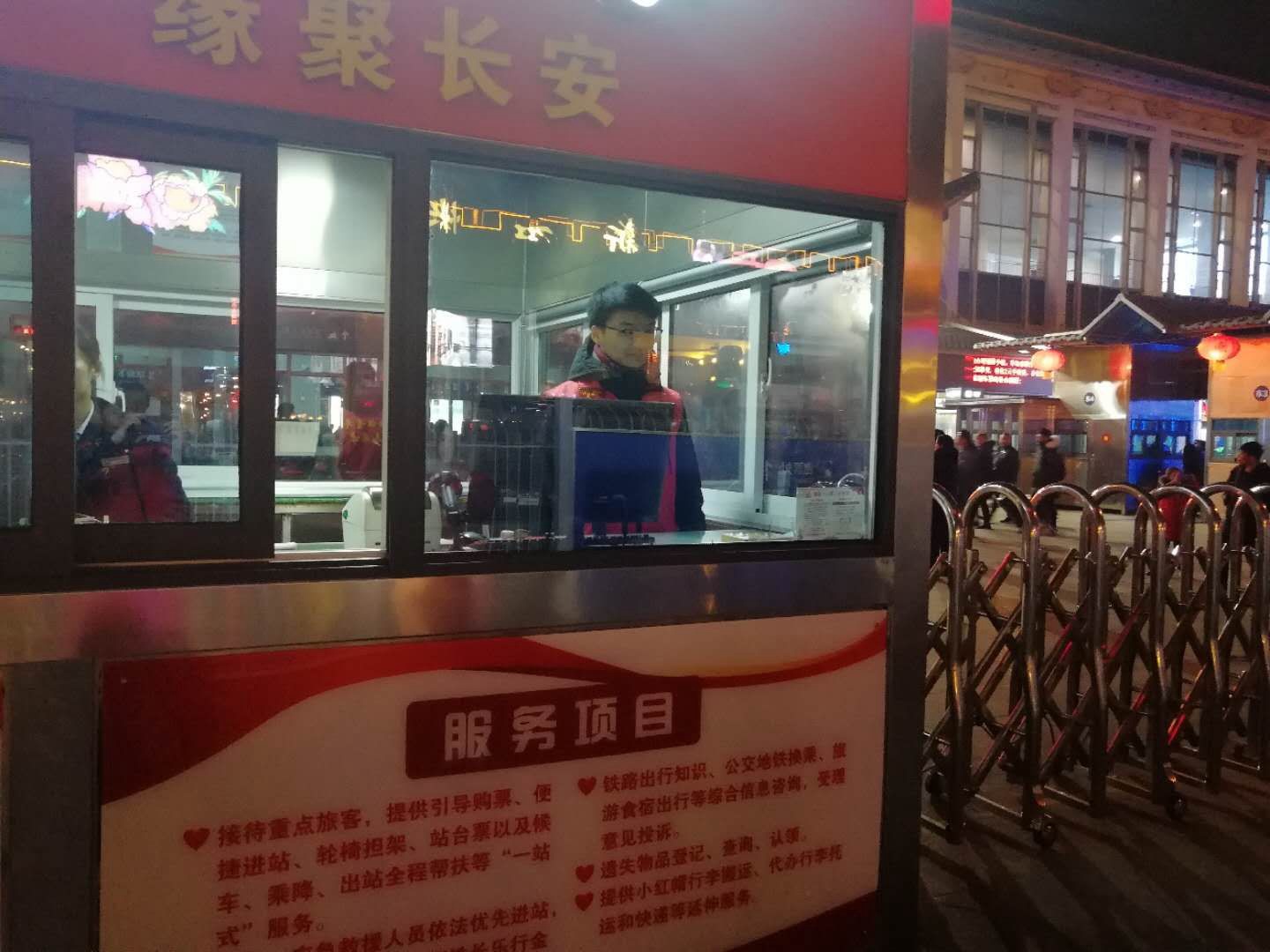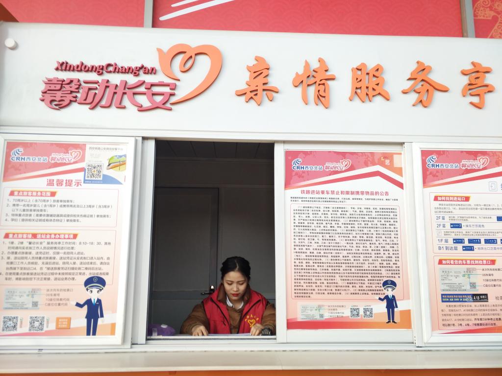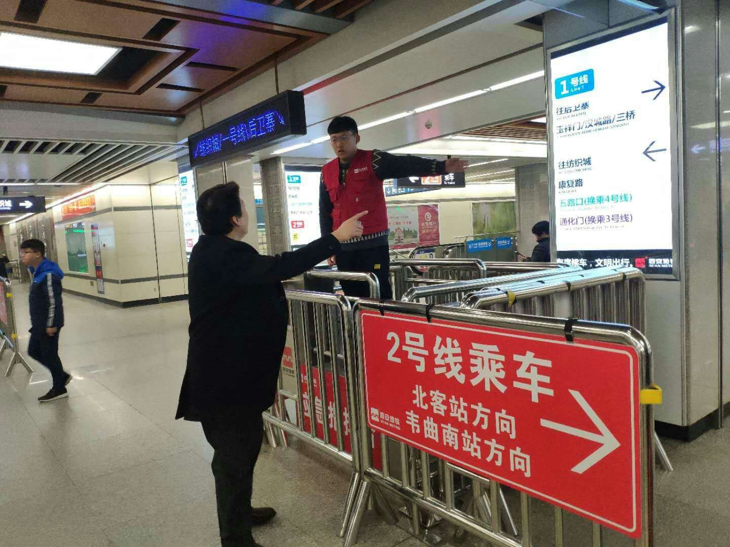西安地铁服务队的70余名志愿者平均每天志愿服务时长4小时,志愿者们在西安地铁2号线北大街站与西安地铁1号线五路口站为乘客提供交通换乘咨询,在出站口的闸机和自动售票机疏导人群,维持秩序;帮助老人、孩子以及行动不便的市民乘坐地铁;帮助、引导乘客正确使用自动售票机。