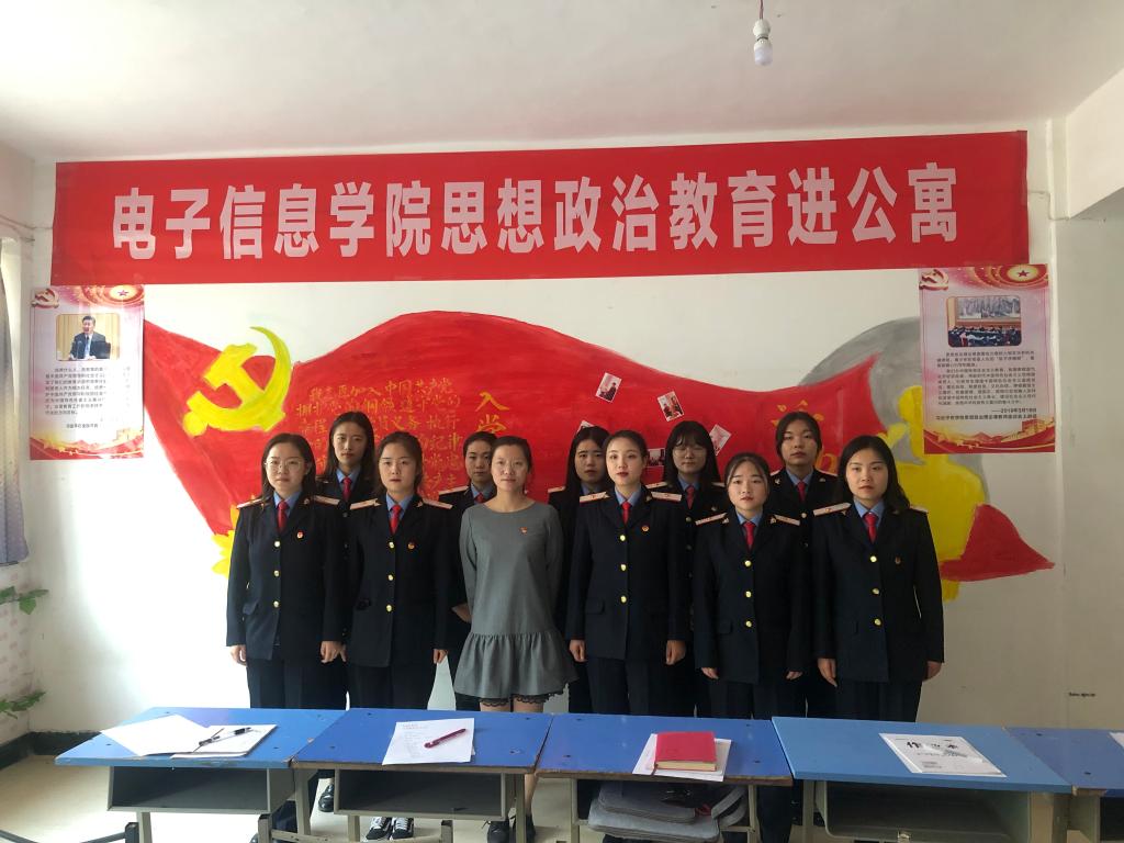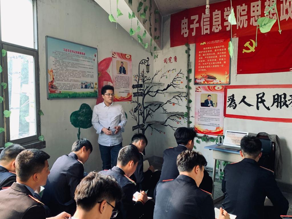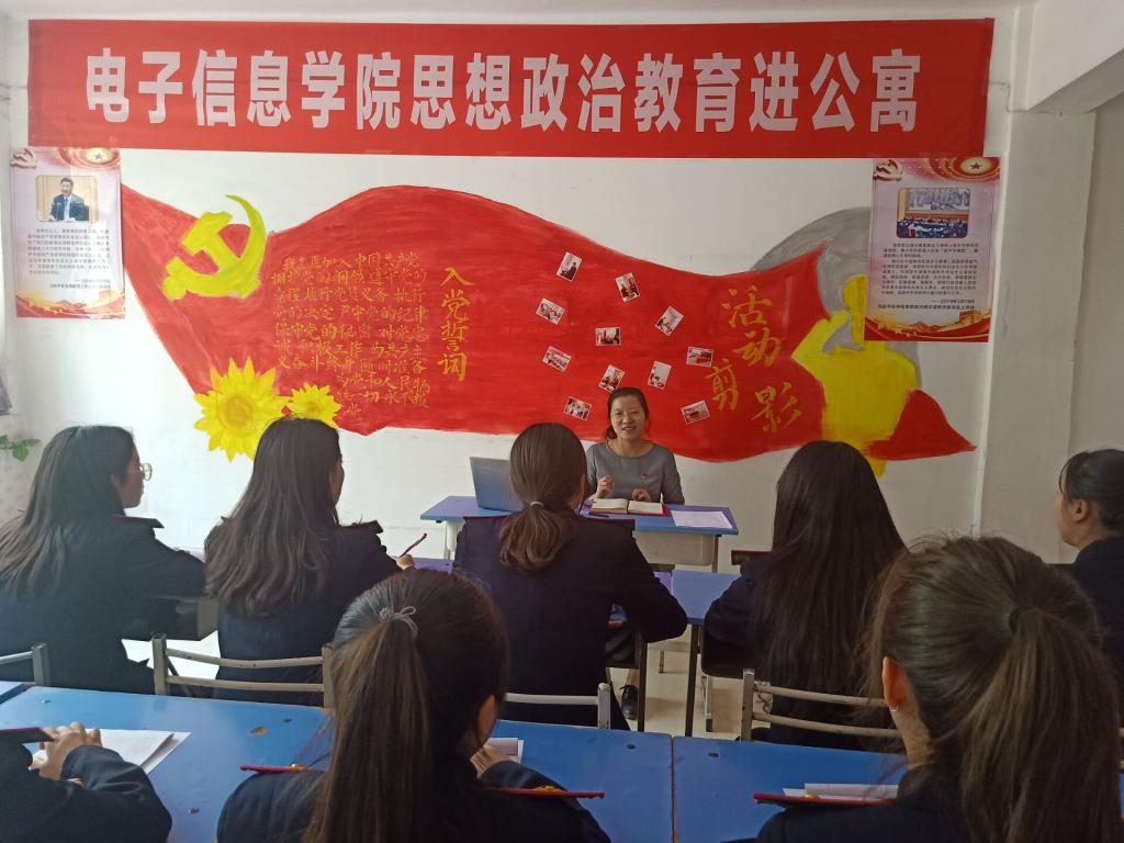 为深入学习贯彻习近平总书记3月18日在学校思想政治理论课教师座谈会上讲话精神,切实推进学生工作党支部“党员四进两联系,担当作为铸安全”工作特色。4月8日,电子信息学院在男女生公寓开展了思想政治教育进公寓活动,活动由电子信息学院学工办辅导员胡士亮和李璇主讲,30余名学生参与了本次活动。
