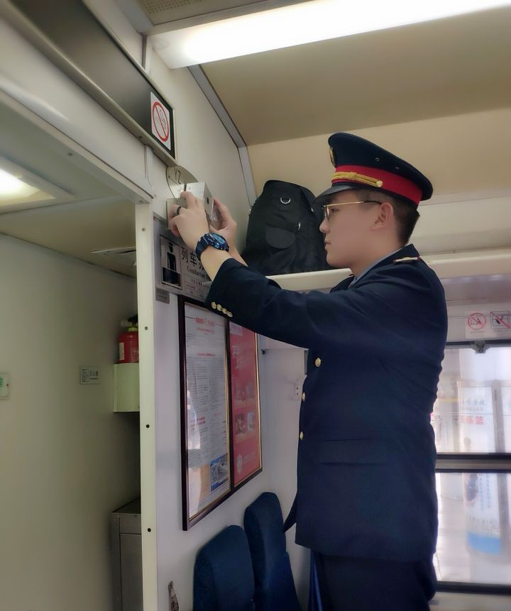 这是张闫鹏因为春运人员抽调,第一次承担卧铺车厢的服务工作,与以往承担的硬座车厢服务工作相比,有很多不同,也是全新的挑战。然而在上车之前,他认真熟悉业务,不断磨练技能,在车上,他用心观察每一位乘客,充分照顾乘客的需要,认真做好服务工作,努力做到一名称职的卧铺车厢乘务员。他说:“不管我在哪趟车上,不管我在哪个岗位上,为乘客竭诚服务始终是我工作的宗旨。”