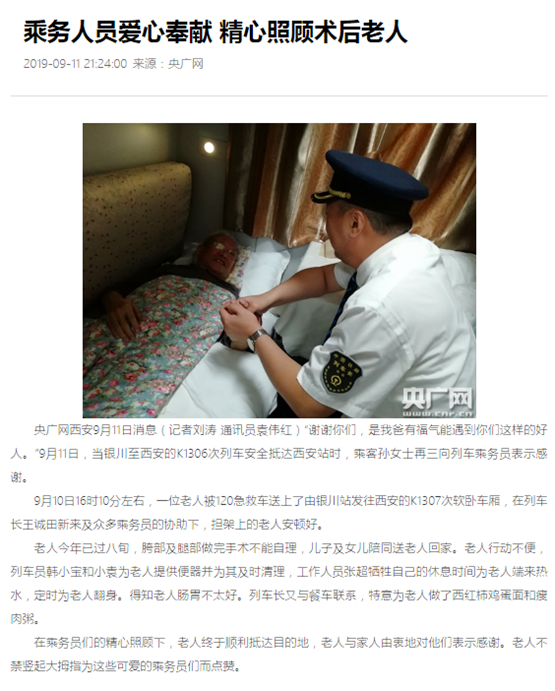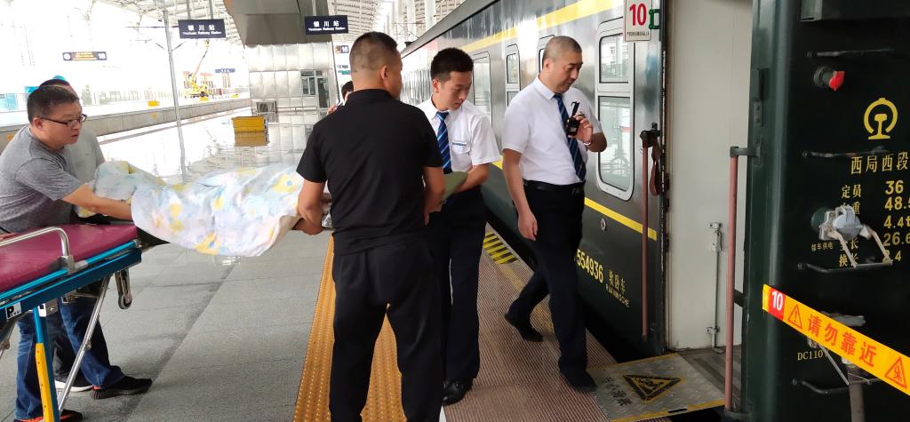 2019年9月10日,k1307次列车实习生张超,在银川站准备放行期间,站台上来一辆救护车送来一位重点旅客。一位八十四岁的老先生,因左腿骨折刚做完手术,准备返回西安。