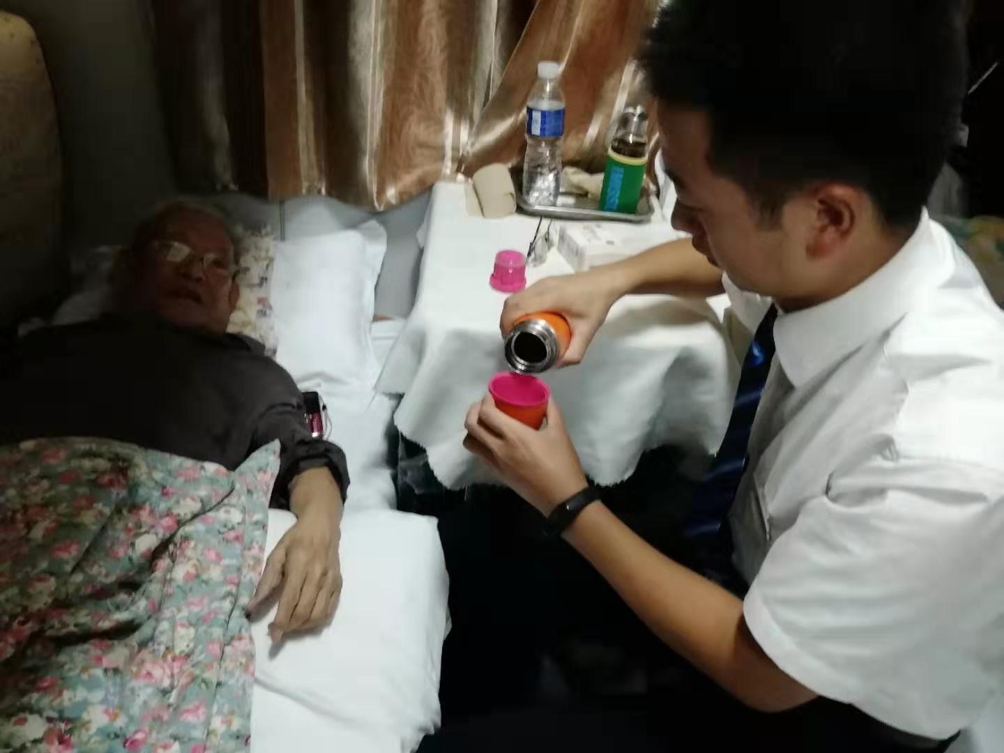 实习生张超主动帮助,帮抬担架,提行李,一路上悉心照顾,送水,陪老人聊天,安抚情绪。直到9月11日列车到达西安站,将老人送上救护车。