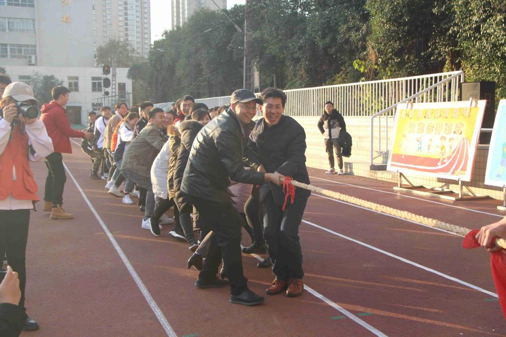 物流管理1903班和铁道运营1905班率先打响拔河比赛的对决,双方队员竭尽全力,均想用最足的力气为班级争光添彩。现场气氛热烈,同学们的呐喊声此起彼伏。最终物流管理1903班取得胜利。老师们也参与到比赛中来,和获胜方展开友谊赛。他们一改平日里的温文尔雅,在赛场上势如猛虎,毫不逊色,经过激烈的比拼最终取得了胜利。