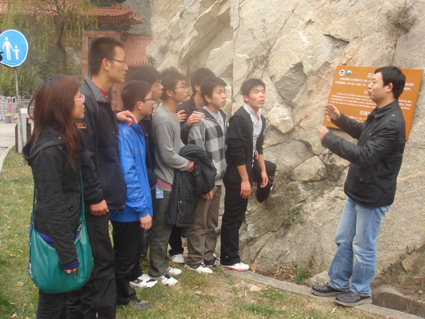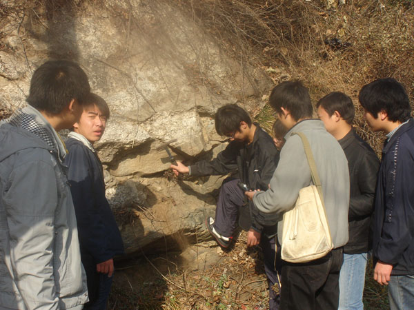 骊山是矗立在渭河盆地的一个孤立的掀斜地垒式块状山体,由于内部断裂作用形成了牡丹沟断层和骊山北缘断层。断层带附近具有地震活动性强、新老滑坡多、地裂缝发育、冲沟中泉眼连绵四大特点,是第四纪以来断裂活动明显的标志。学生利用地质罗盘仪测得牡丹门附近的粉砂岩体的走向和倾角,观察了岩层间的接触情况及岩石剪切节理面。又到前骊山采石场附近采集了粉砂岩、片麻岩、石英岩、花岗岩等岩石样本,参观了第四纪黄土地貌、由河流侵蚀作用形成的“V”字型河谷、滑坡崩塌等地质现象。