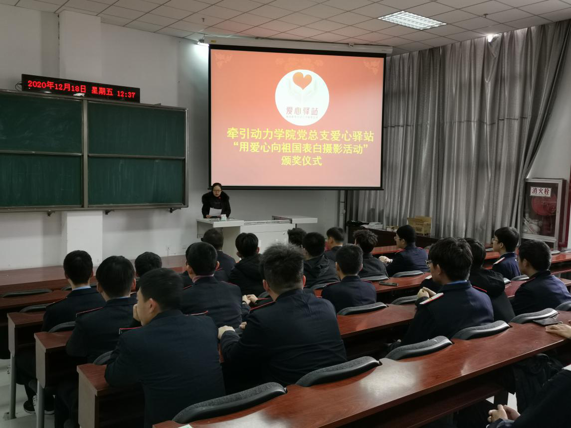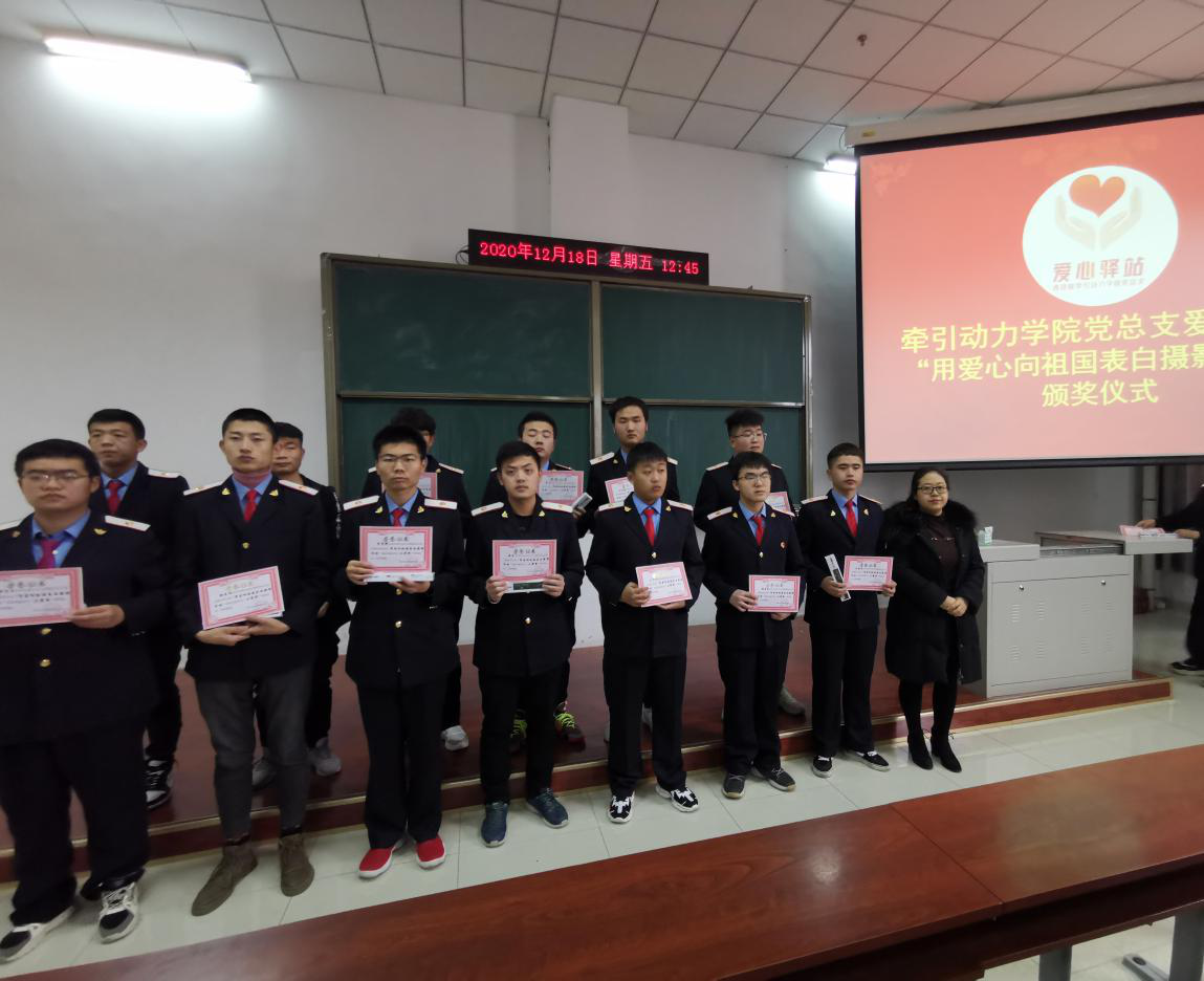 近日,牵引动力学院党总支爱心驿站在牵引一楼阶梯教室举办“用爱心向祖国表白”活动颁奖仪式。