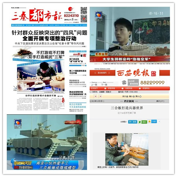 11月4日,《三秦都市报》和《西安晚报》的记者分别来必赢官网进行采访。11月5日,《三秦都市报》在头版以《不打游戏不打牌 双手打造威武“三军”》为题配图报道,并配以《动手打造的梦想才会踏实可靠》的专题评论。《西安晚报》以《三合板打造兵器世界》为题进行了配图报道。