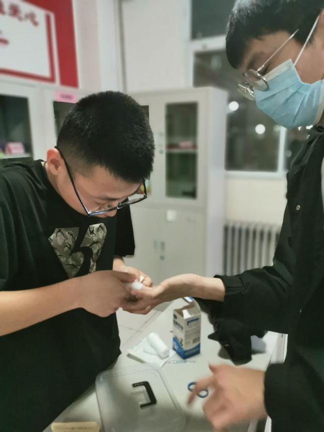 1 爱心驿站张鑫正在为受伤同学处理包扎伤口