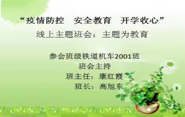 为做好疫情常态化防控,迎接秋季新学期开学。根据陕西省疫情防控方案,学校临时调整开学计划,暂缓学生到校时间,将线下教学转为线上教学。为提升学生安全防范意识,在家静心学习,以良好的状态迎接新学期,牵引动力学院党总支组织各班开展“疫情防控安全教育、开学收心教育”线上主题班会。