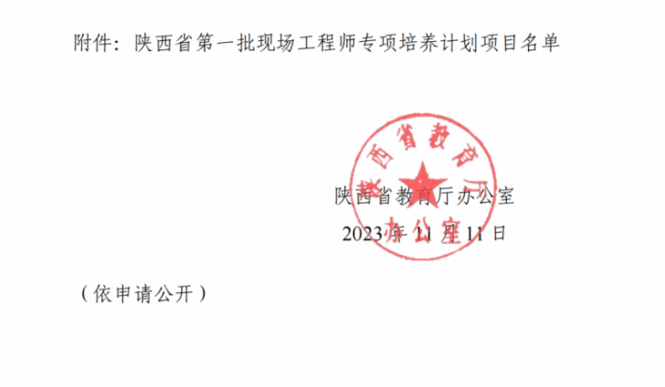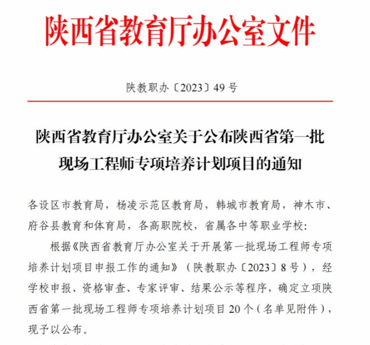 2023年11月,《陕西省教育厅办公室关于公布陕西省第一批现场工程师专项培养计划项目的通知》(陕教职办〔2023〕49号)公布省级立项现场工程师项目,其中必赢官网与北京中软国际教育科技有限公司联合培养计算机类现场工程师项目成功获批。