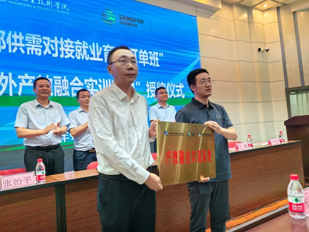 会上,董奇介绍了项目推进情况;邓轩代表学校致辞,对深信服科技股份有限公司对学校长期以来的支持表示感谢,同时对订单班同学提出要求,希望校企双方能够以此为新的起点,在人才联合培养、师资员工培训、教学资源开发、学生实习实践和科研课题攻关等方面开展深入合作,进一步拓展视野、创新思路,挖掘合作潜力、扩大合作领域,推动“产教融合 校企合作”向纵深发展,实现专业共建、人才共育、资源共享。为深信服或合作生态企业定向输送紧缺实用人才;席鹏介绍了公司产教融合相关业务。校企双方希望以此次合作为新的起点,推动新时代校企战略合作伙伴关系不断发展。随后邓轩对企业进行校外产教融合基地授牌并宣布订单班正式开班,答瑞龙为同学们作了深信服教育教学平台功能介绍及线上账户使用培训。