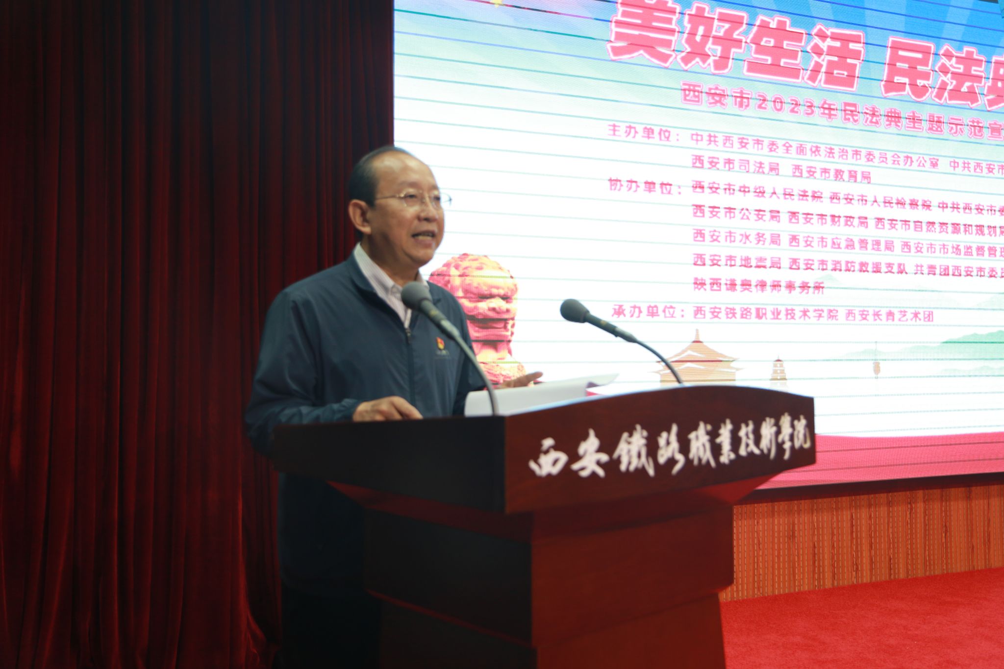 活动由市教育局副局长王纲主持。任治军致欢迎辞,表示学院将加大宣传教育力度,提高普法教育水平,强化师生法制观念,培养法治思维,塑造法治精神,争做尊法学法守法用法的积极践行者,为助力美丽西安建设做出自己的积极贡献。杨丽萍向学生赠送民法典学习资料。张兴平强调开展民法典学习宣传活动是深入学习贯彻党的二十大精神,全面贯彻落实习近平法治思想,进一步推进高校法治建设的具体举措,也是推进更高水平法治西安建设的生动实践,要充分认识民法典颁布实施的重要意义,不断提升民法典宣传教育工作水平,切实加强对高校法治建设的组织领导。