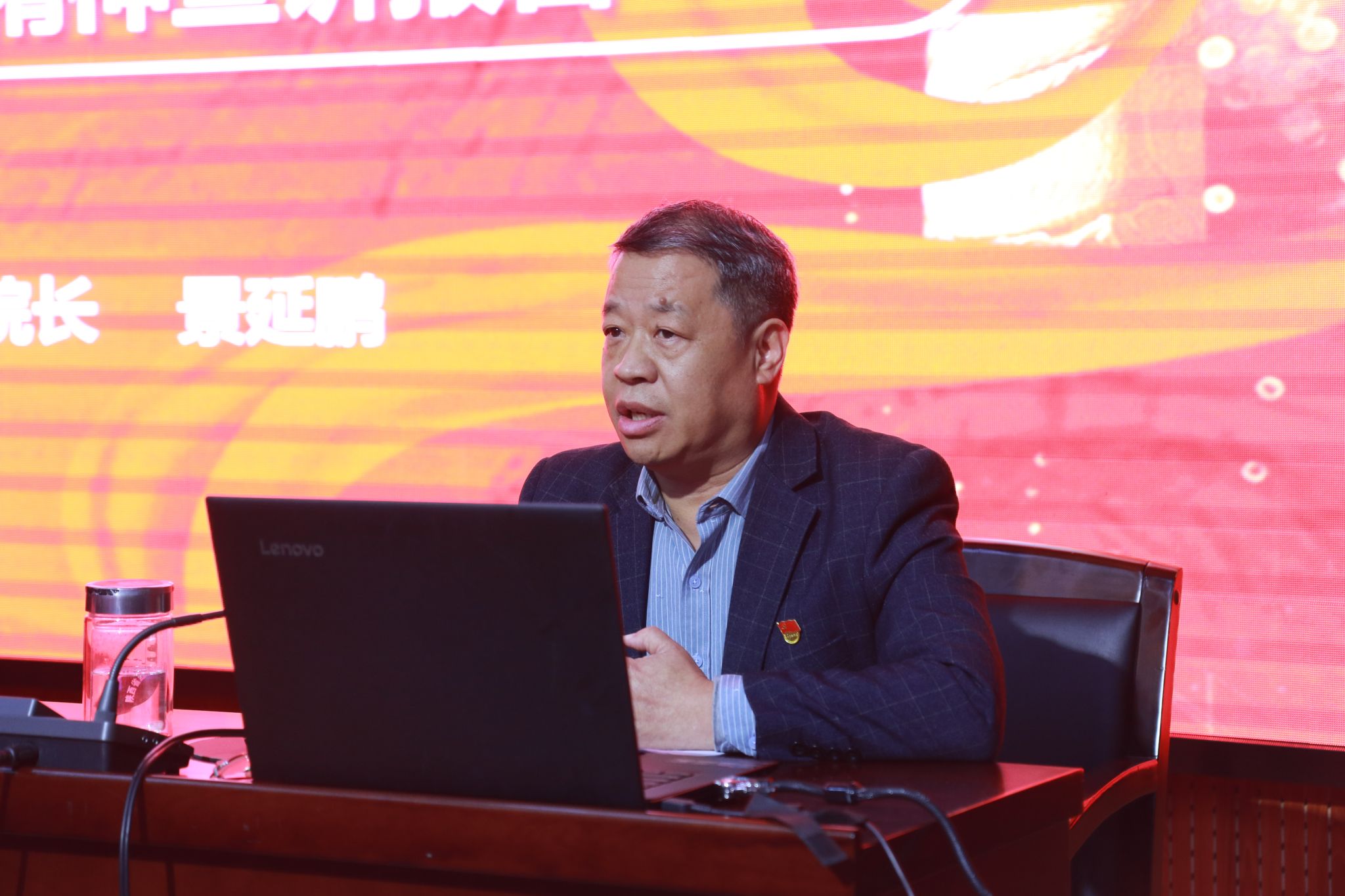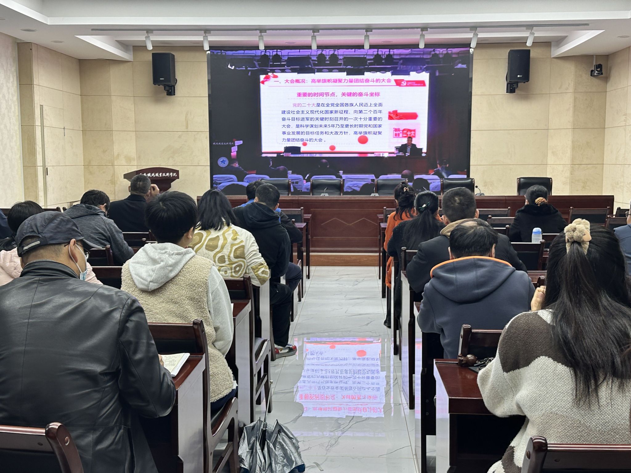 省委党的二十大精神“马院院长宣讲团”成员、陕西省高职高专思政课教学研究会副会长、陕西省职教学会高职高专思政课教指委副主任,学院马克思主义学院院长景延鹏以“谱写新时代中国特色社会主义更加绚丽的华章”为主题,从党的二十大会议概况、主题和主要成果,党过去5年的工作和新时代10年的伟大成就,马克思主义中国化时代化,中国式现代化的深刻内涵,以及迎接挑战、奋进新征程等六个方面,解读了党的二十大报告。