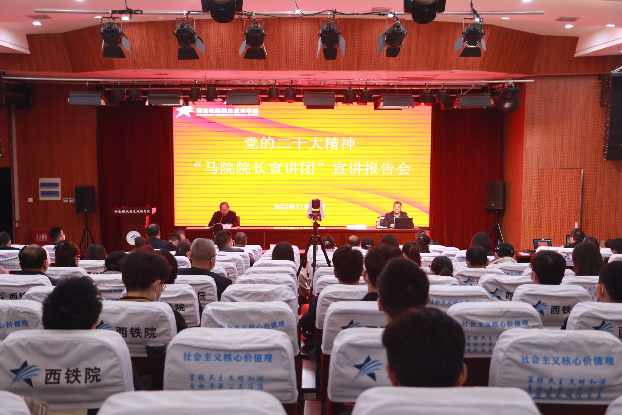 11月11日下午,必赢bwin线路检测中心举行党的二十大精神“马院院长宣讲团”报告会。全院党员干部、思政课教师、学工干部和学生党员参加报告会。报告会采取主会场、分会场同步直播形式,除在港务校区设主会场外,学院还在自强、临潼和龙首三个校区分别设有分会场。报告会由学院党委副书记任治军主持。