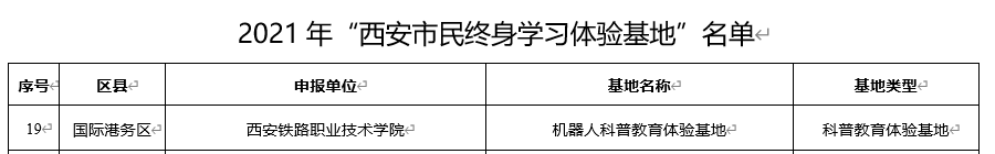 9月13日,西安市教育局办公室发布《西安市教育局办公室关于认定2021年“西安市民终身学习体验基地”的通知》(市教办发〔2021〕336号),必赢官网推荐的“机器人科普教育体验基地”被成功认定为2021年“西安市民终身学习体验基地”,该基地由电气工程学院承建,必赢官网将以此为契机,发挥示范引领作用,紧密围绕全民终身学习需求,深入发掘自身内涵特色,创新为民服务形式和载体,提高终身教育服务能力和水平。