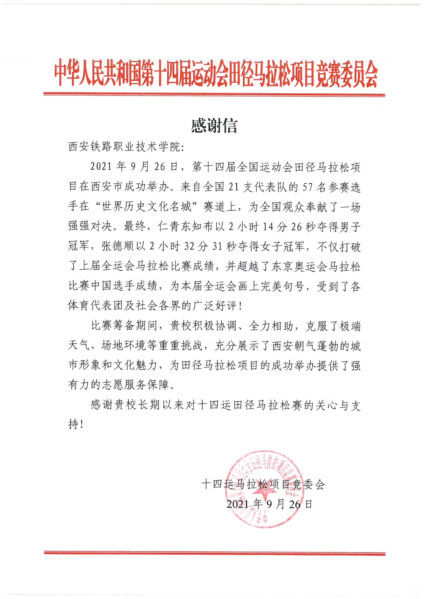 近日,必赢官网收到了第十四届全国运动会田径马拉松项目竞赛委员会发来的感谢信,信中对必赢官网积极配合十四运会的志愿服务工作表示诚挚的感谢。