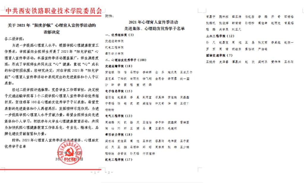 经过认真组织评选,学院对宣传季活动中表现突出的交通运输学院、机电工程学院、牵引动力学院等3个二级学院授予2021年“阳光护航”心理育人宣传季活动优秀组织奖。对贺佳琪等100名同学授予心理育人宣传季活动“心理助友优秀学子”荣誉称号。