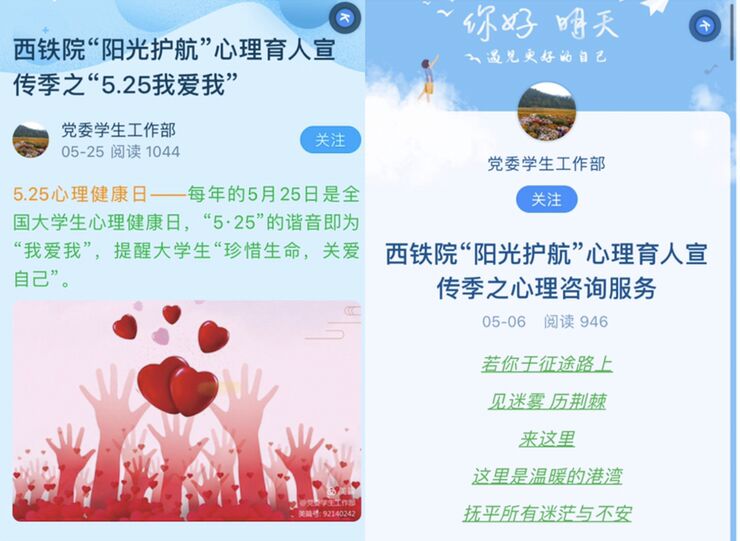 宣传季期间,学院积极举办2021年“阳光护航”心理育人宣传季启动仪式,今日头条、西安教育电视台均对学院启动仪式进行了宣传报道。在全院举办了“用爱滋润心灵 用心呵护生命”5.25大学生心理健康日户外宣传活动,积极营造全院重视心理健康的氛围。