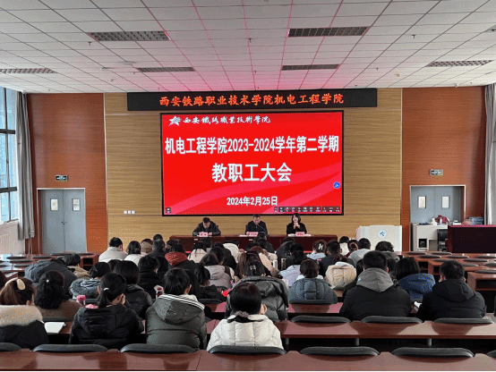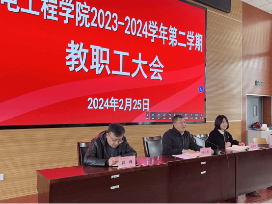 2月25日,机电工程学院在阶梯教室召开新学期教职工大会。学院全体教职工参会,会议由副院长郭峰主持。