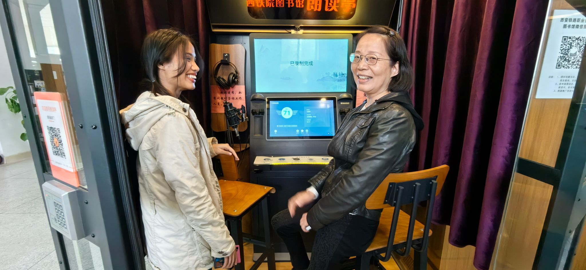 参观交流期间,马建萍用中英文向同学们介绍了图书馆的馆藏情况、图书查找及借阅方法、电子阅览瀑布屏及朗读亭的使用等。李黎为同学们讲解了图书自助借还系统以及图书借阅有关事项。崔苗为同学们介绍了数字阅览空间、电子阅览室及纸质期刊等资源。