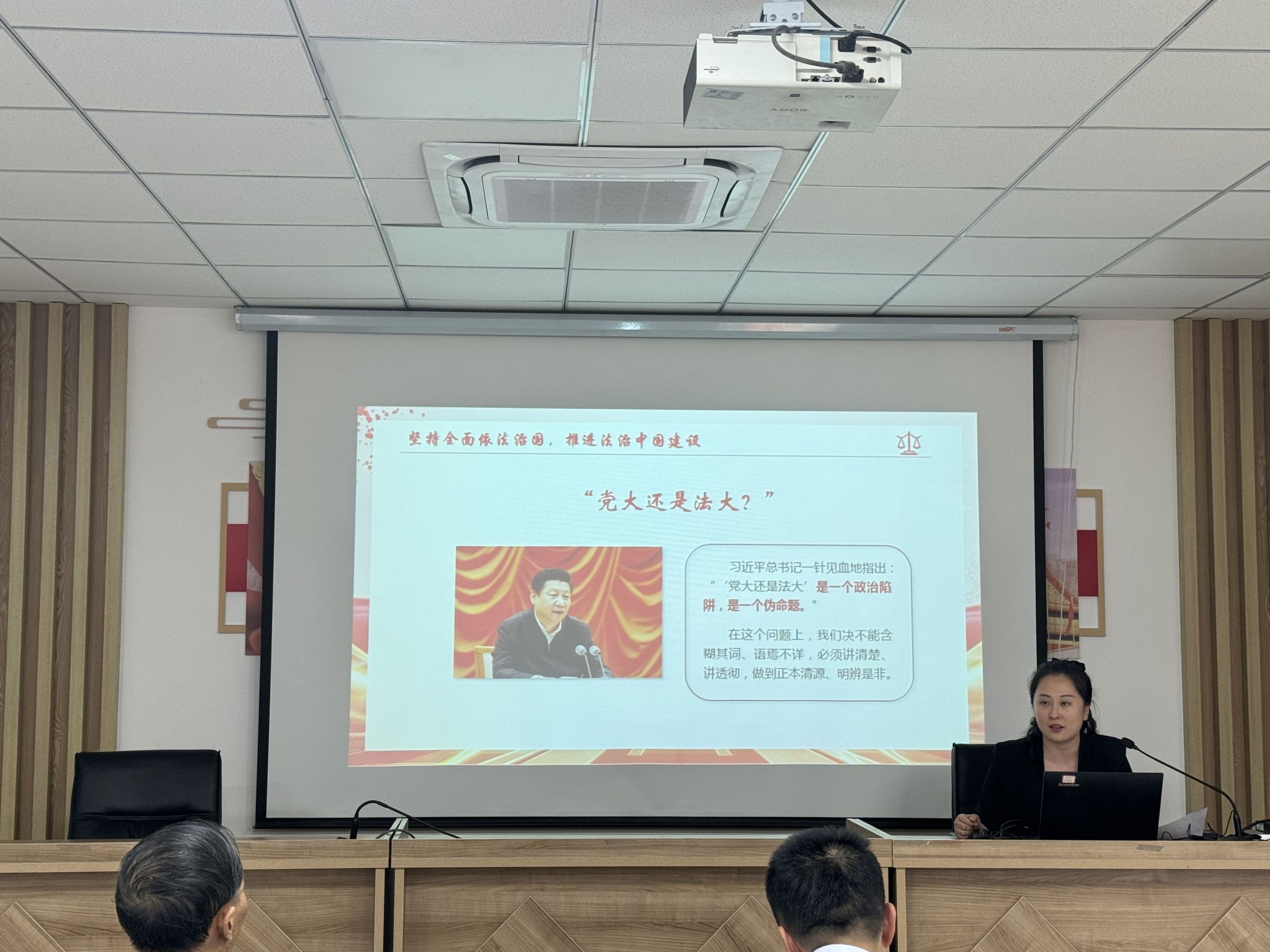 最后,张帆以《坚持全面依法治国,推进法治中国建设》为主题,深入浅出地分析了“法治兴则民族兴,法治强则民族强”,从“坚持走中国特色社会主义法治道路”、“推进法治中国建设”两个方面对全面依法治国进行讲解。宣讲过程中,张帆老师以“党大还是法大”这一伪命题为例,说明党和法、党的领导和依法治国是高度统一的关系,加深了大家对依法治国的认识。