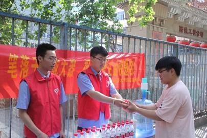 高考期间,志愿者们尽早来到高考考点爱心助力服务站,拉上醒目的条幅,设置志愿服务台向考生及家长提供矿泉水、风油精、藿香正气合剂等物品,用实际行动助力高考。