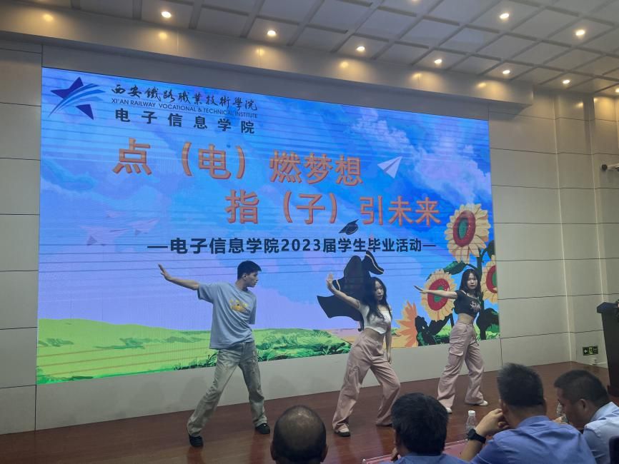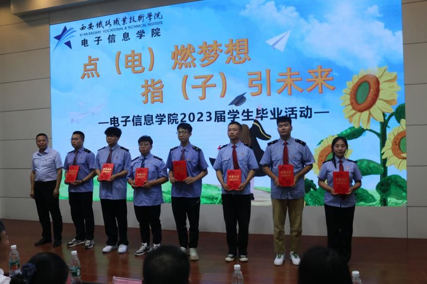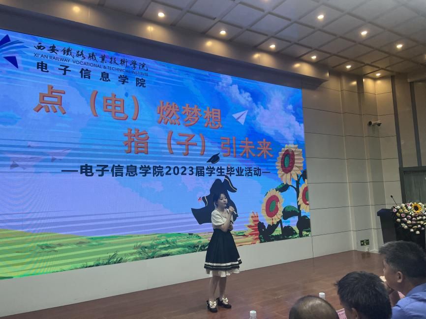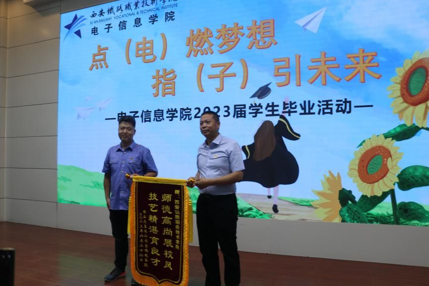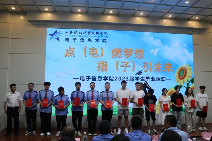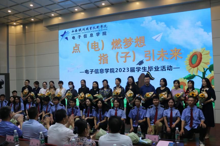 7月6日下午,电子信息学院在自强校区阶梯教室为毕业生设计并举办了一场以“点(电)燃梦想指(子)引未来”为主题的毕业纪念活动。宝鸡电务段副段长刘伟、劳人科科长叶勇、职教科科长公茁,学院就业指导中心副主任马建萍,教务处实践教学科科长邹星,电子信息学院党总支书记吴西蒙、院长董奇、副院长冯国良、各教研室主任(专业带头人)、以及全体辅导员班主任与毕业生代表们共同相聚,一同赓续传承家国情怀,一同追忆三年的美好时光,一同启航未来的人生旅途。