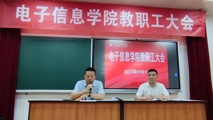9月10日,电子信息学院在自强校区教学楼407教室召开新学期教职工大会,全体教职工参加会议。会议由电子信息学院副院长冯国良主持。