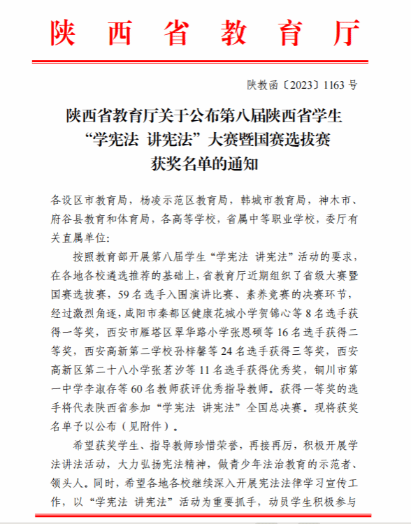 近日,陕西省教育厅公布的《关于第八届陕西省学生“学宪法 讲宪法”大赛暨国赛选拔赛获奖名单的通知》中,必赢官网选派的交通运输学院铁路物流2201班学生杨卓在比赛中荣获高校组三等奖。