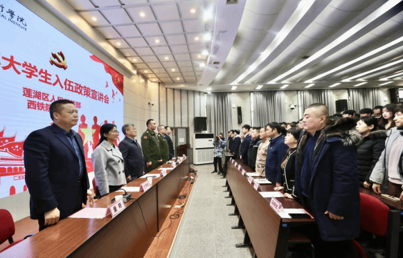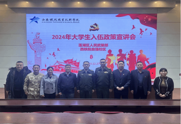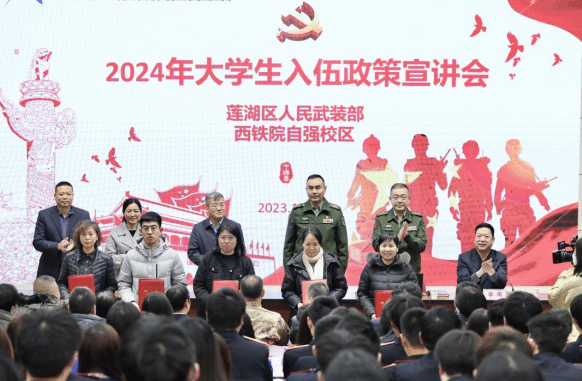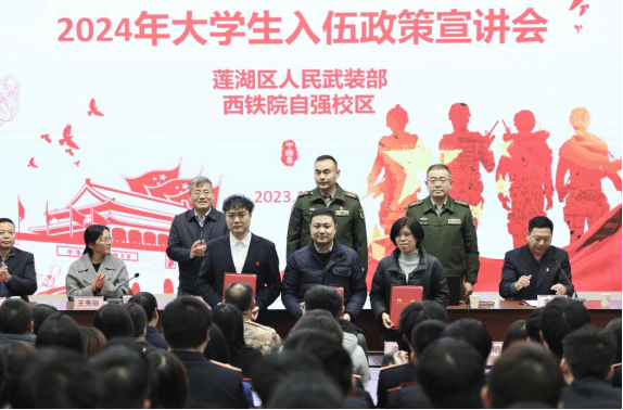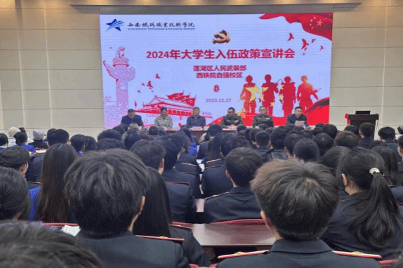 12月27日下午,必赢bwin线路检测中心自强校区教学楼东阶梯教室报告厅内座无虚席、青春激扬,莲湖区人民武装部在此成功举办了2024年大学生入伍政策宣讲会。莲湖区区委委员、莲湖区人民武装部上校政委王洋、莲湖区人民武装部上校部长彭明友、学院武装部部长、安全保卫处处长毛卫军、交通运输学院党总支书记王秀丽、电子信息学院党总支副书记、院长董奇、自强综合管理处副处长李勇、交通运输学院、电子信息学院学工办主任、辅导员、班主任及260余名学生代表等参加了宣讲会。校区3000余名学生在智慧教室同步观看了直播。宣讲现场气氛热烈、掌声雷动、宣讲会既深入宣传征兵政策,又对青年学子进行了生动的国防及爱国主义教育,收效明显。