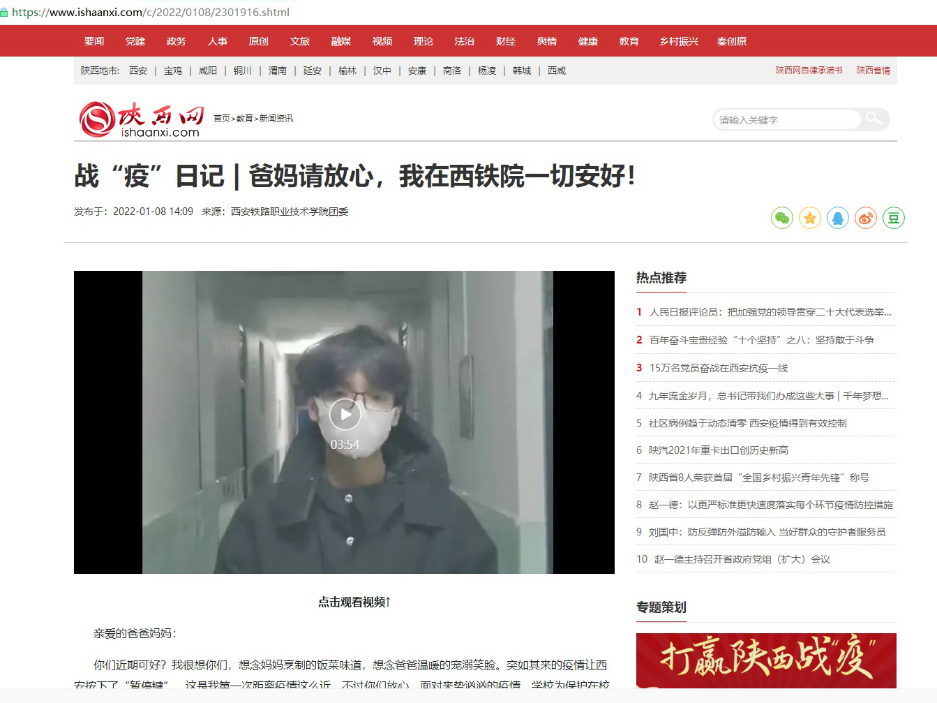 战“疫”日记 | 爸妈请放心,我在西铁院一切安好! - 新闻资讯 - 陕西网https://www.ishaanxi.com/c/2022/0108/2301916.shtml